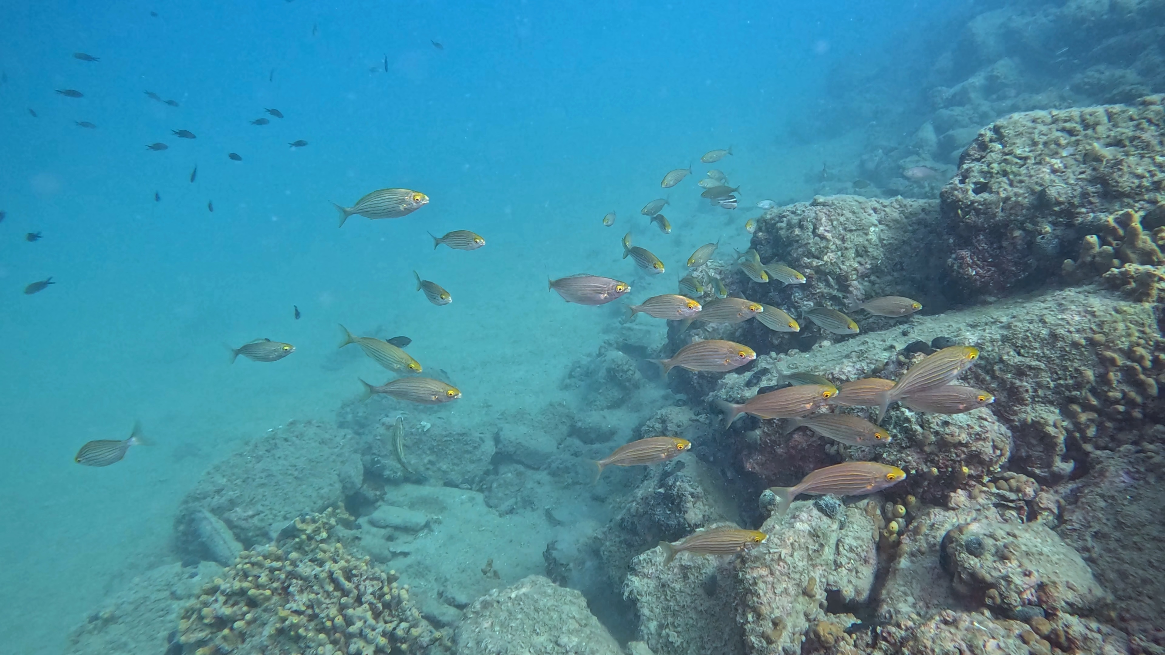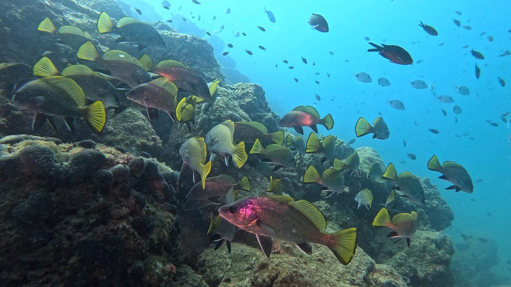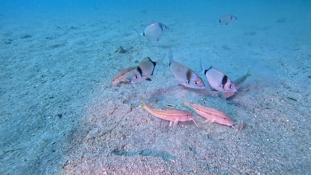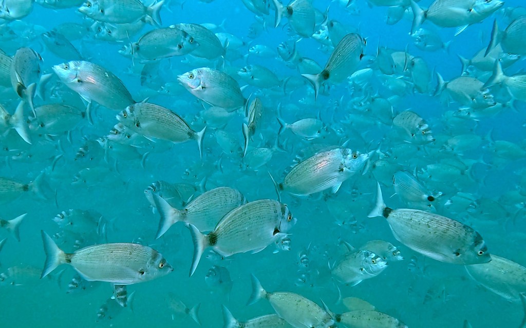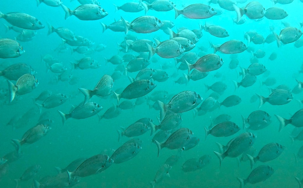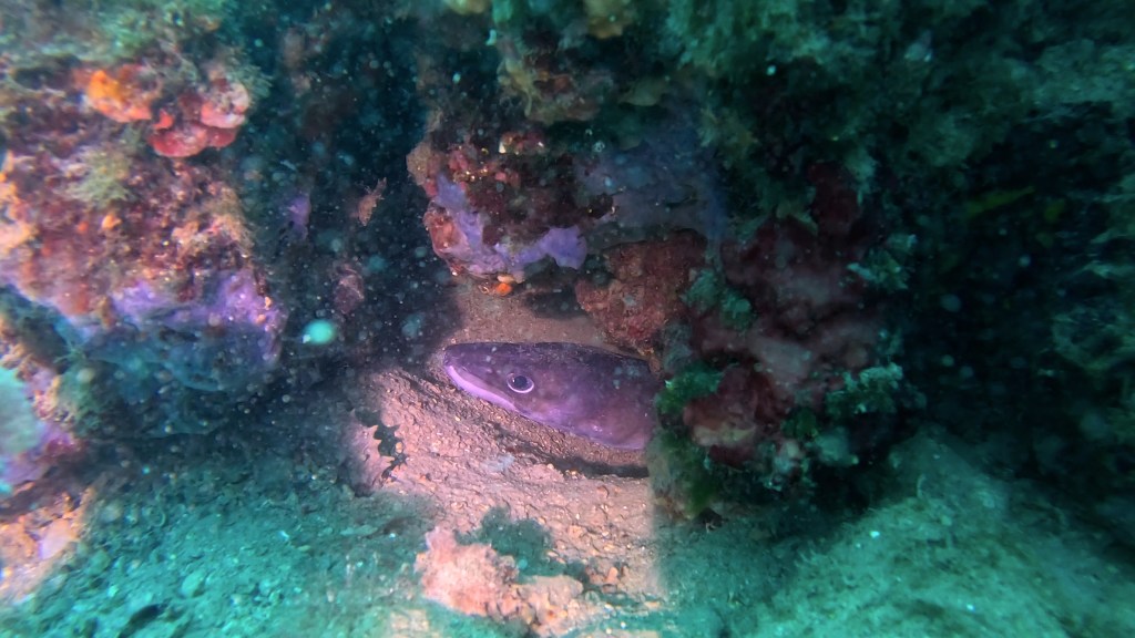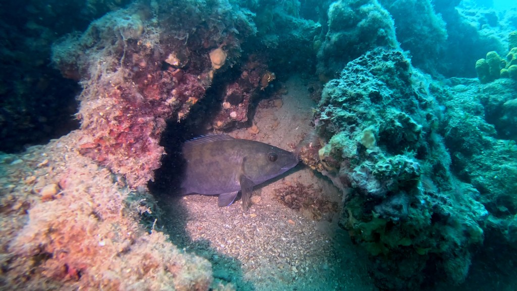 Skalnata brižina omogoča zavetje številnim živalskim vrstam. Nič posebnega ne bo, če boste po poti srečali večje število jastogov, ugorjev ter ostalih vrst rib, ki se skrivajo v zavetju grebena. Pred vami se lahko kar na enkrat pojavi večja jata kavalov, šargov, fratrov ter ostalih vrst šparov. Če k temu dodamo še črnike in dobro vidljivost, si lahko kuliso ustvarite sami na podlagi spodnjih fotografij…
