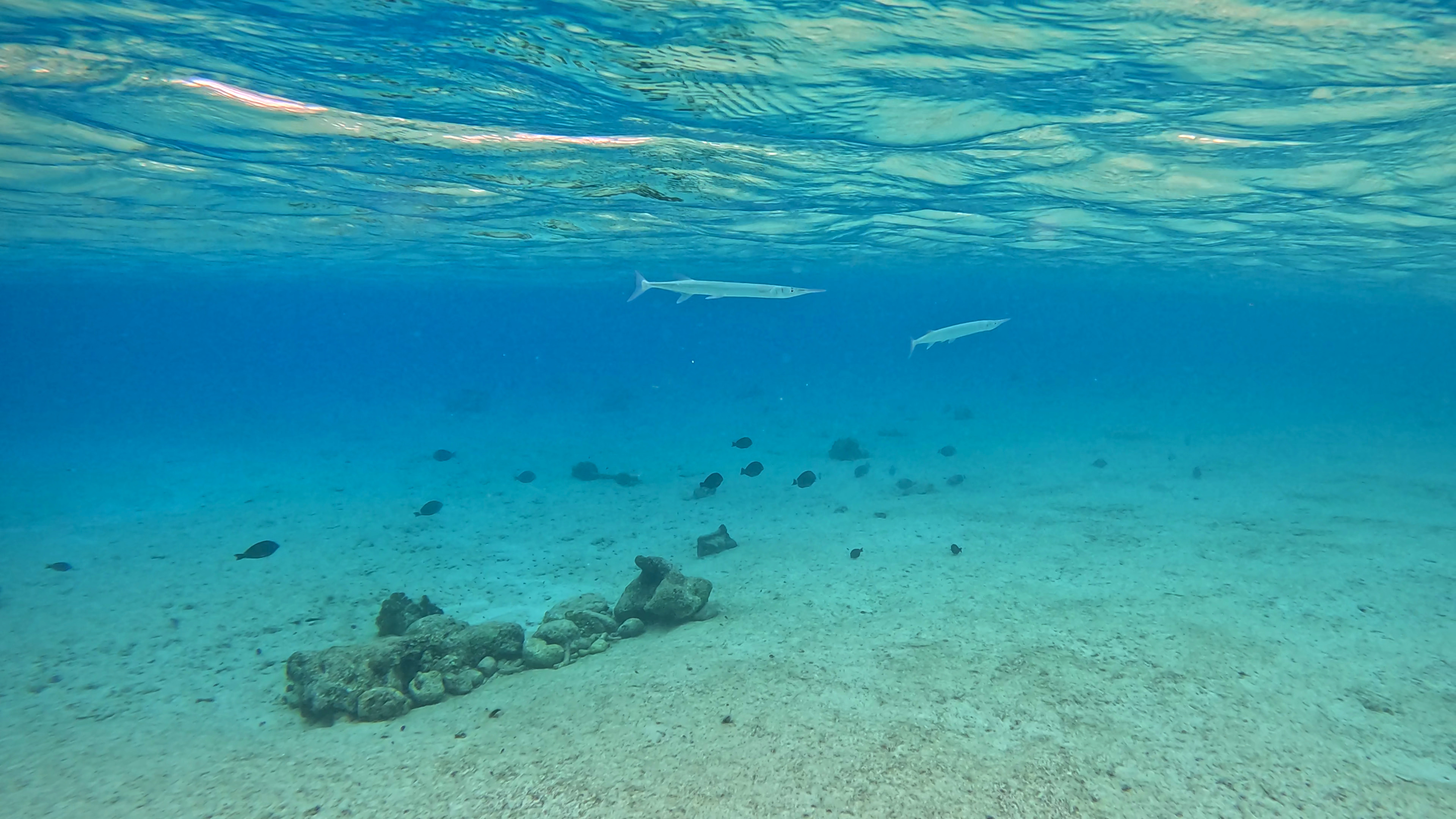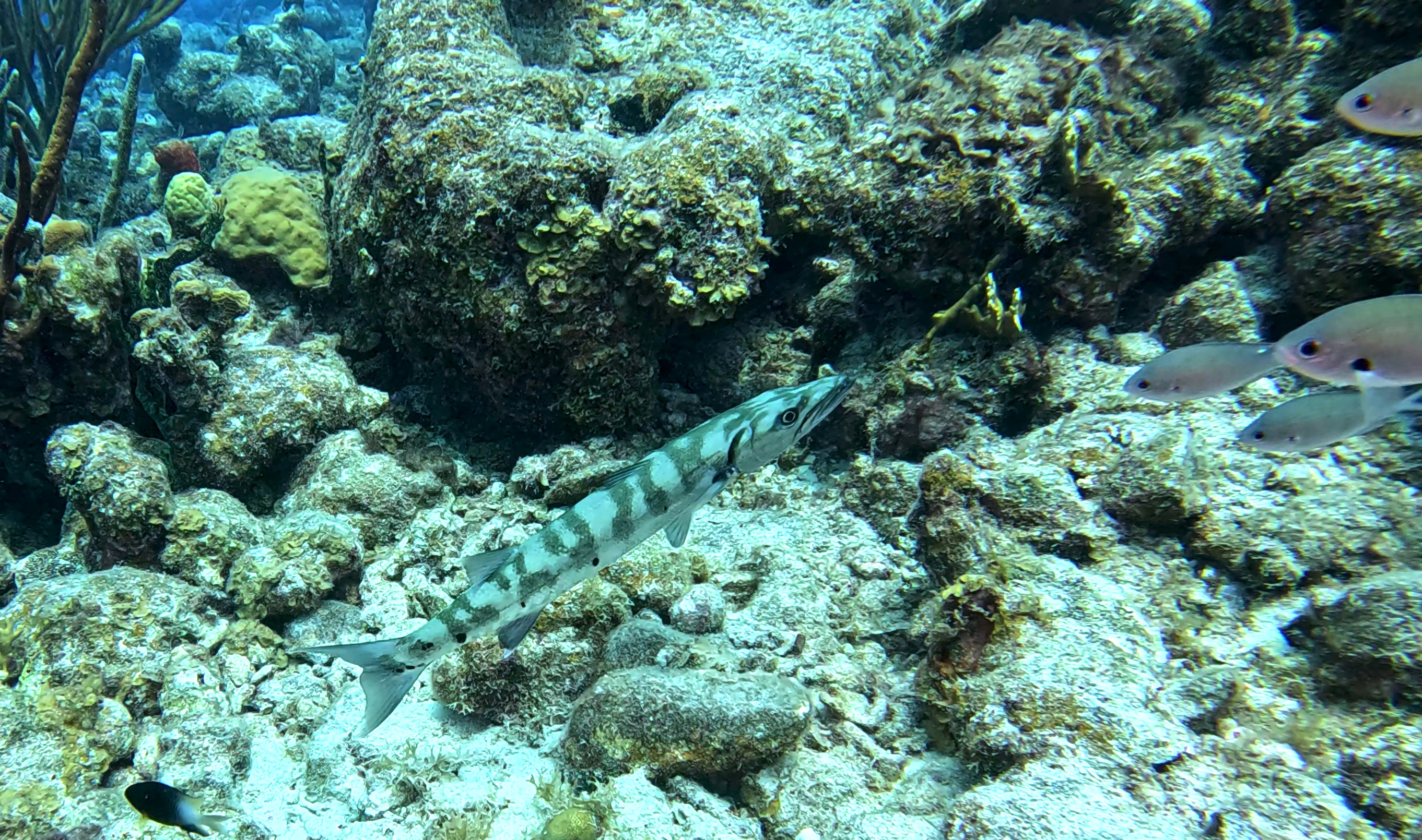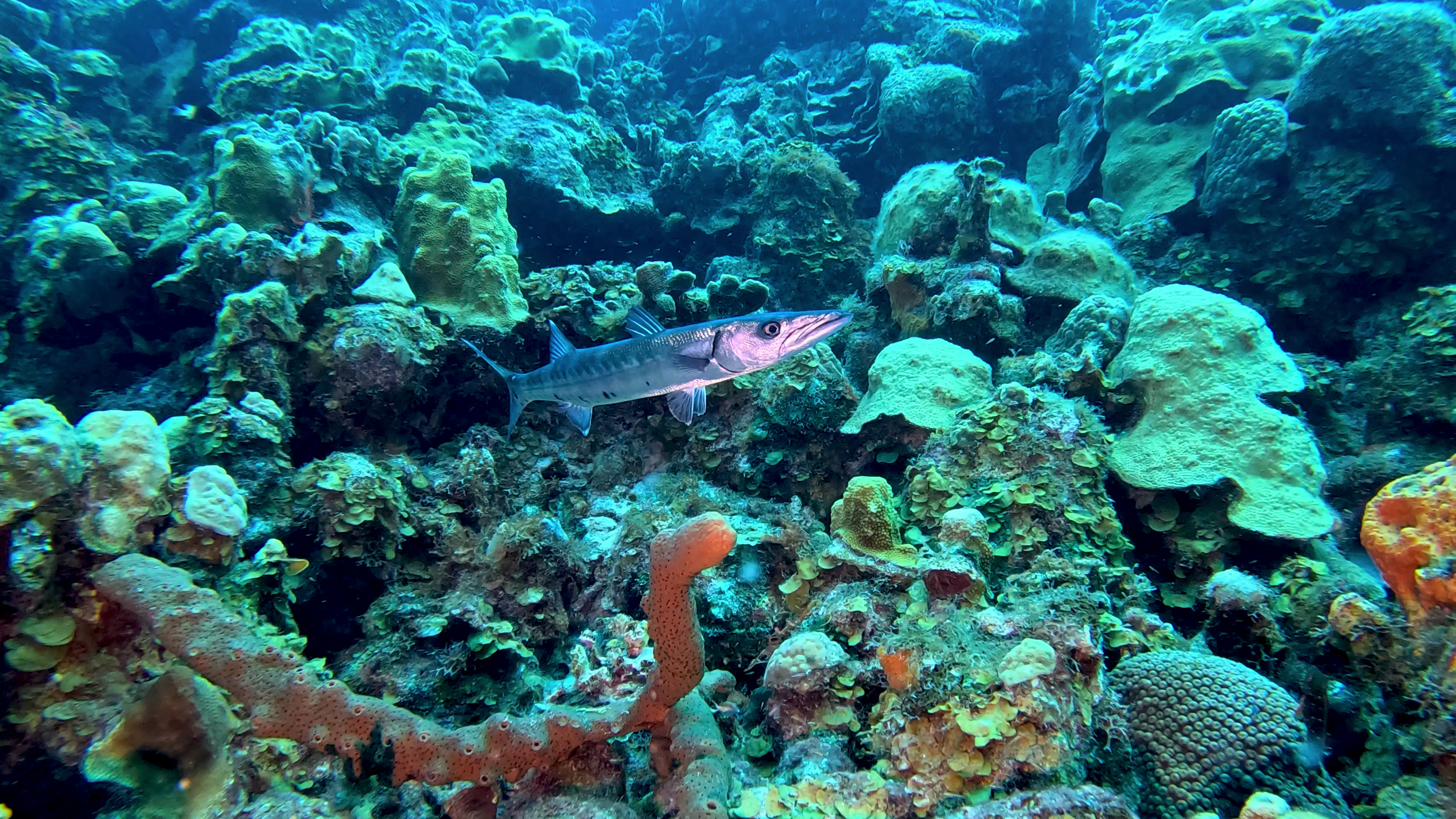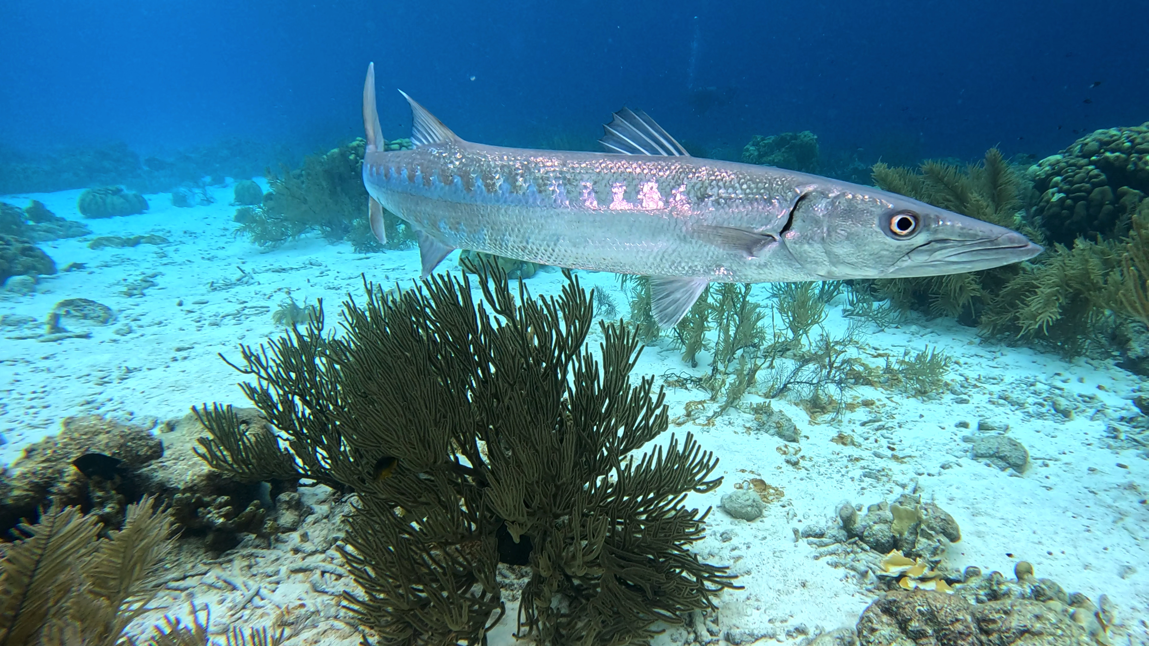 The great barracuda is a large predatory fish with a long, slender body and sharp teeth. It lives in warm tropical oceans, especially in the Atlantic and the Caribbean, often near coral reefs. It feeds on smaller fish and is known for its speed and powerful hunting skills. Attacks on humans are rare.