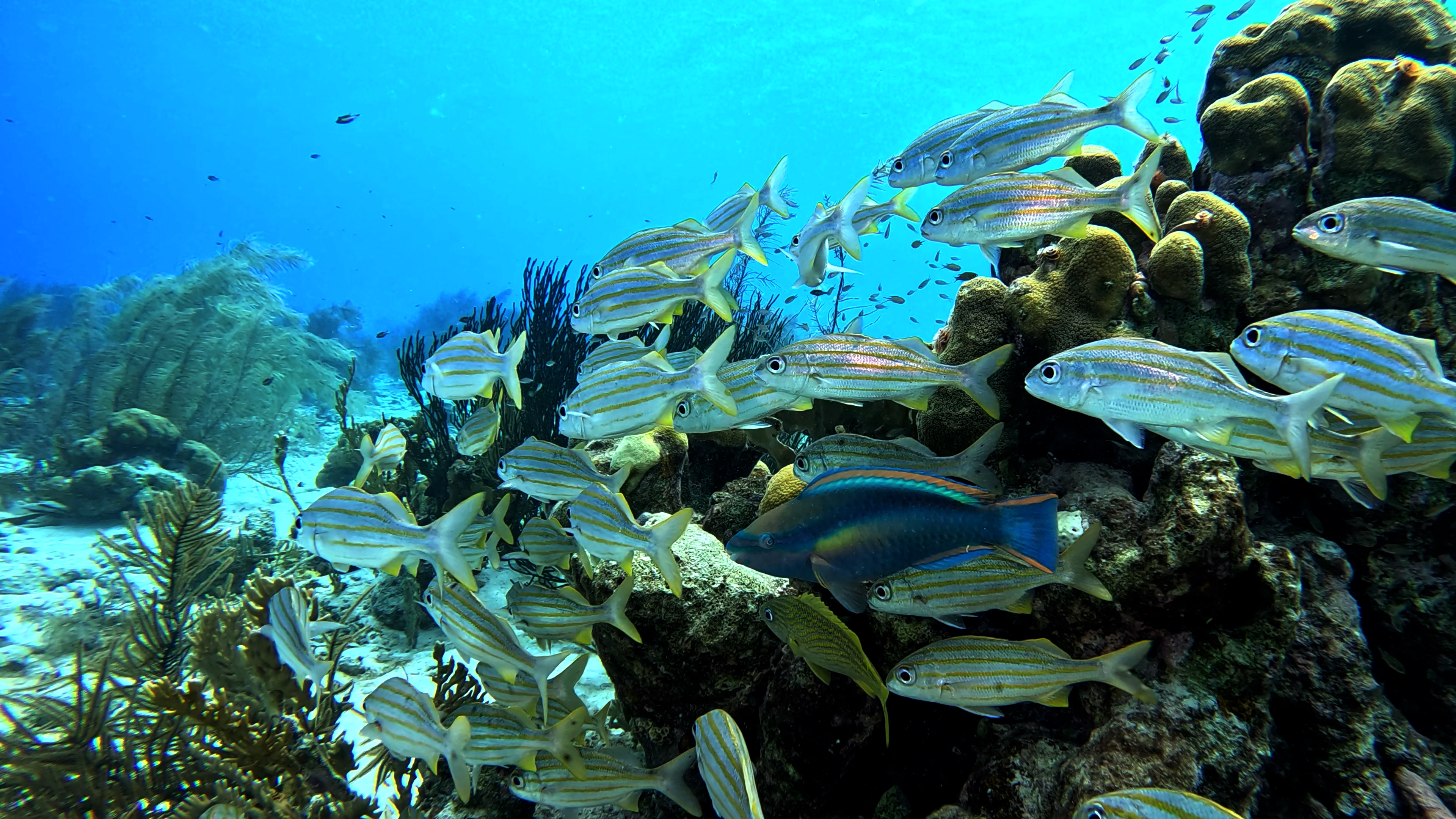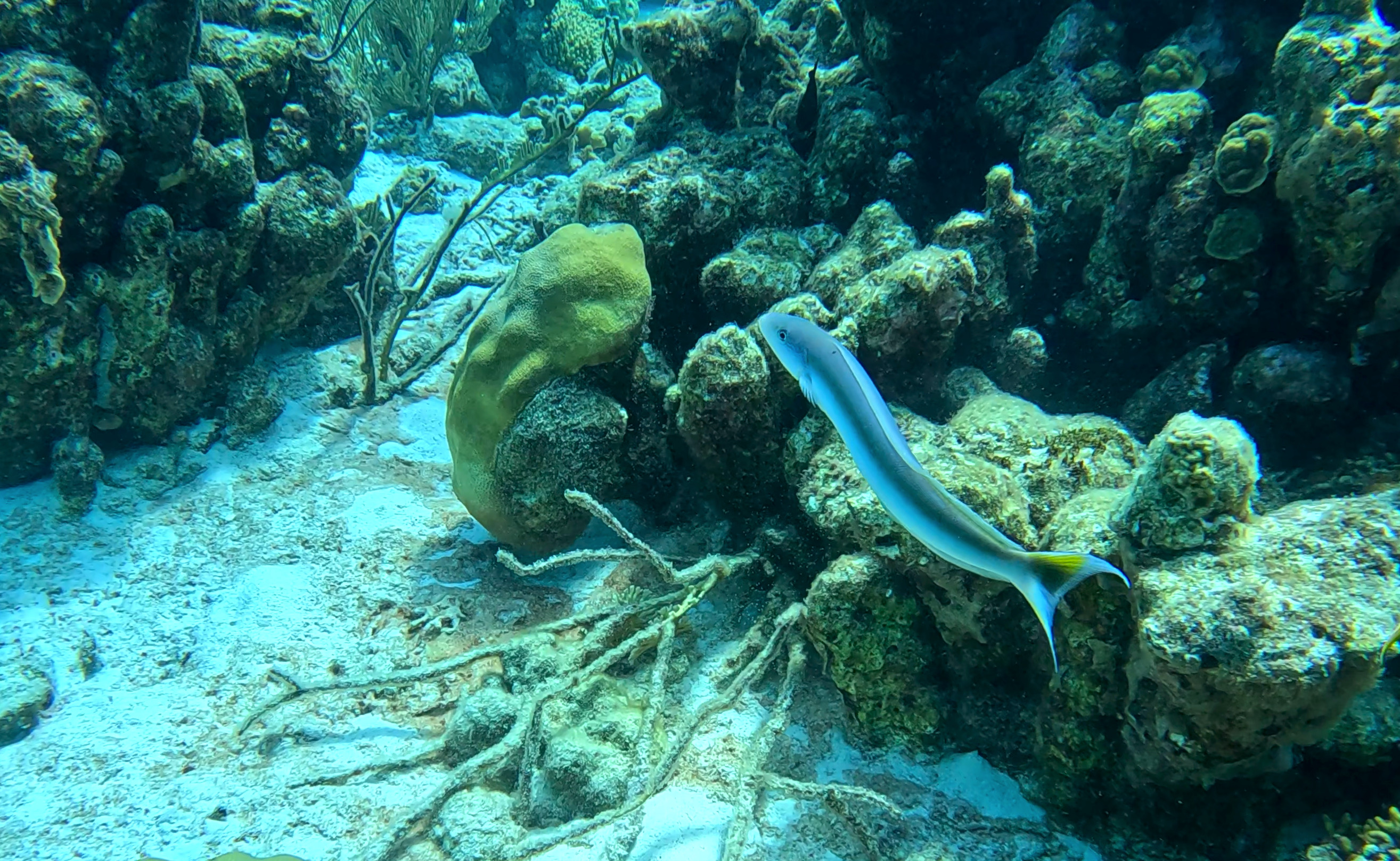 The Yellowtail Snapper is a medium-sized tropical fish with a slender body, silvery-blue back, and a distinctive yellow tail fin. It inhabits tropical Atlantic coral reefs, mainly in the Caribbean Sea and along the coasts of Florida and the Bahamas. Its diet consists of small fish, crustaceans, and plankton. The species is not endangered, but it is sensitive to overfishing and coral reef degradation.