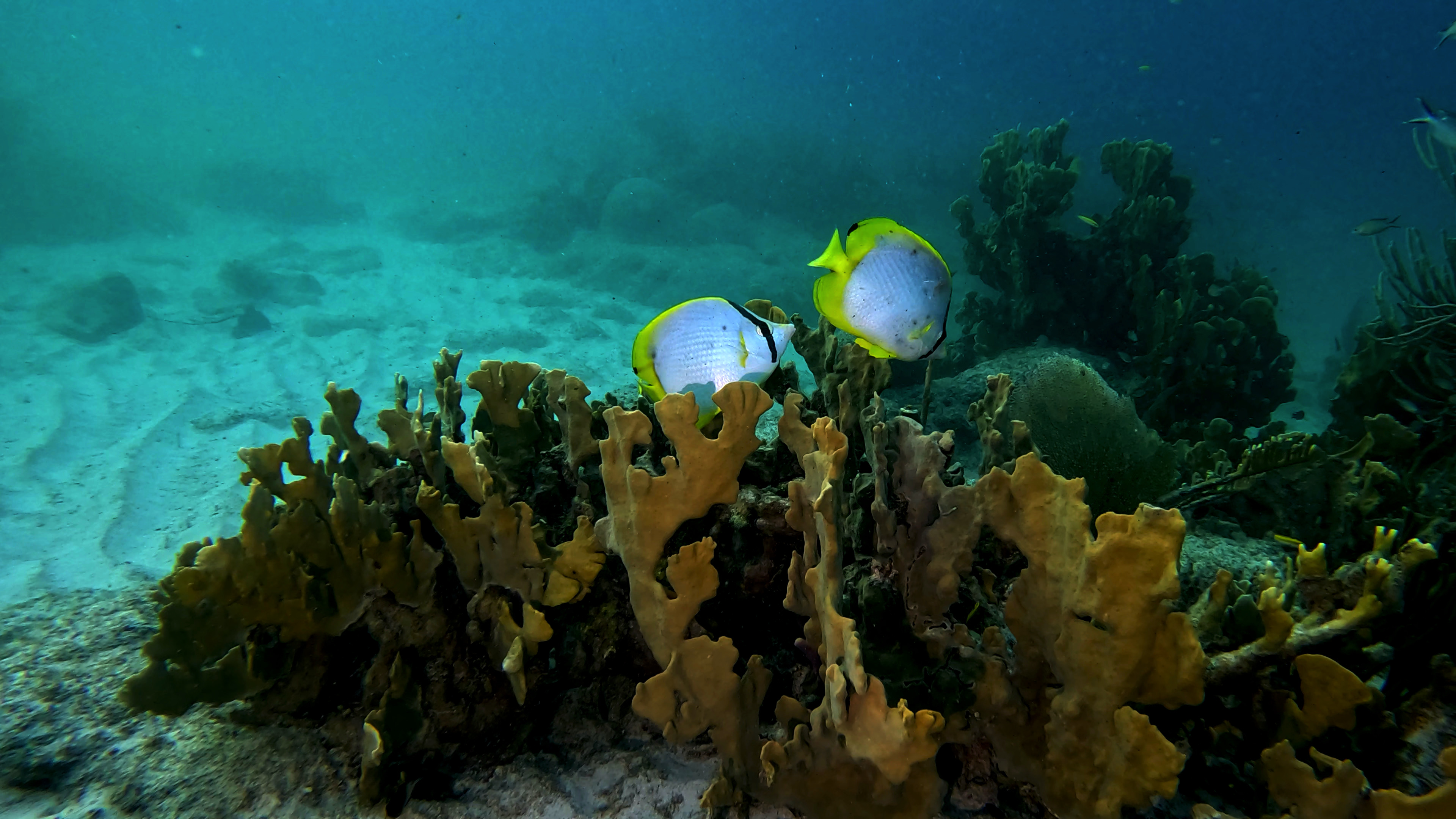 The Foureye Butterflyfish is a small, vibrant species of butterflyfish found in the warm, shallow waters of the western Atlantic Ocean, particularly around coral reefs and rocky substrates. The Foureye Butterflyfish typically grows to around 15–20 cm (6–8 inches) in length. It has a disc-shaped, laterally compressed body, which is characteristic of butterflyfish. The body is mostly yellow with black markings, and the most distinctive feature is the black “eye spot” near the tail, giving it its name. The fish has long, graceful pectoral fins that resemble butterfly wings. Its small, upturned mouth is ideal for picking at coral polyps and small invertebrates. This species is often seen in pairs or small groups, especially during breeding or feeding.