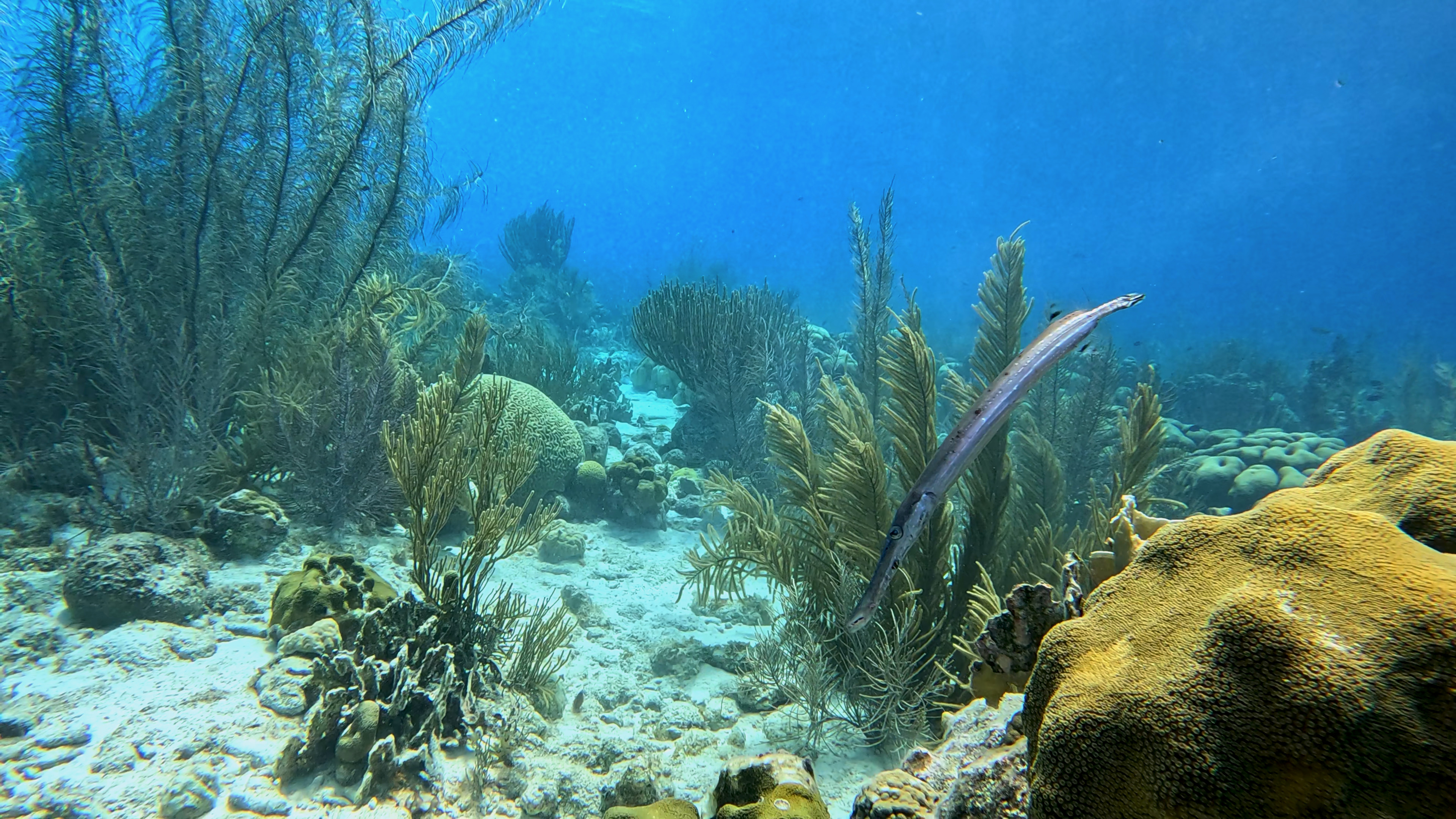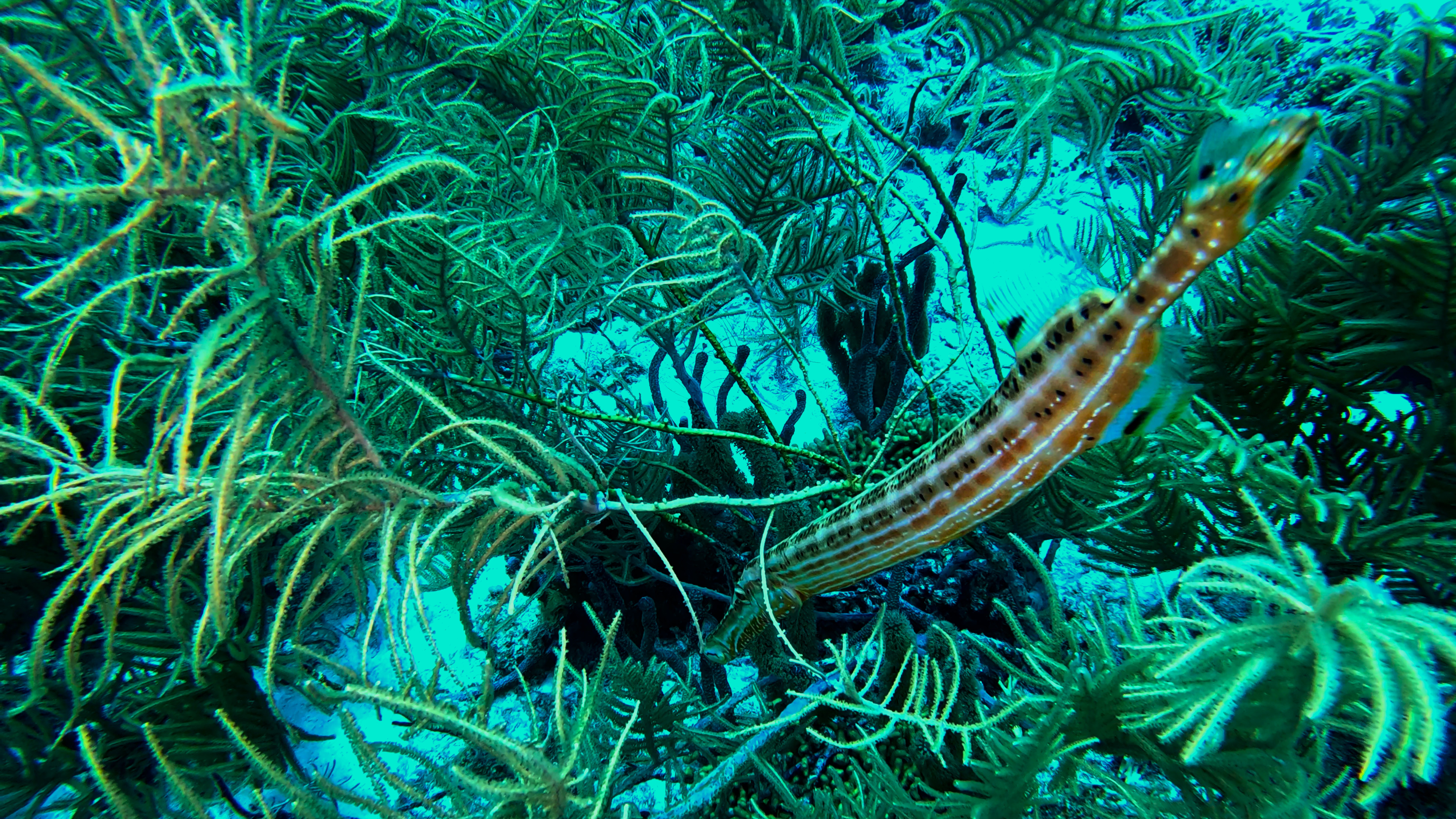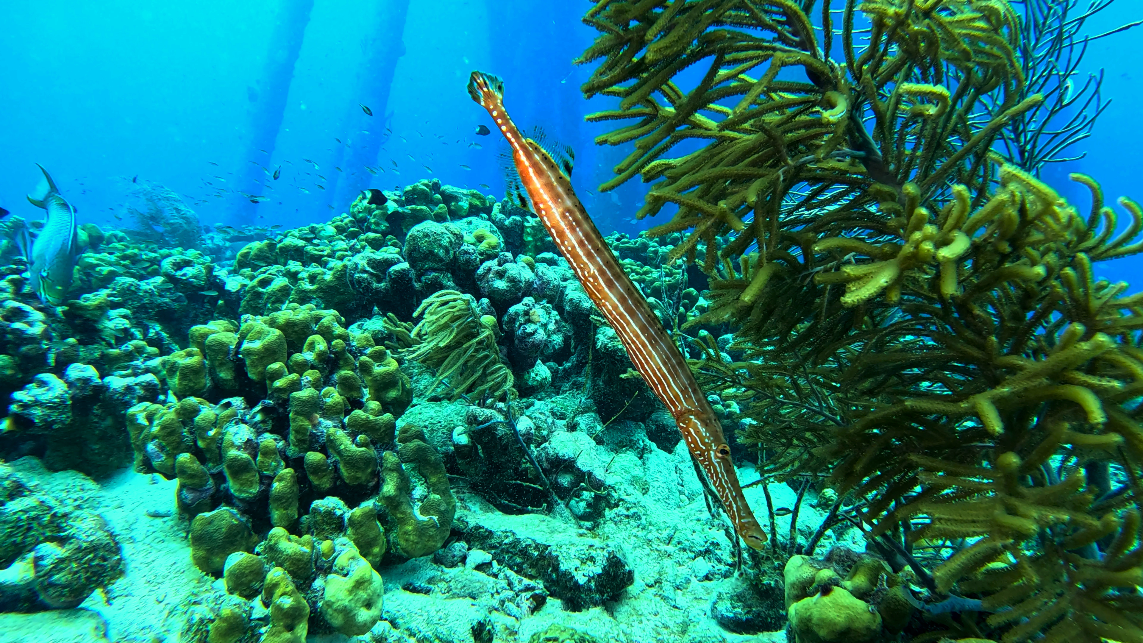 The Trumpetfish is a long, slender tropical fish with a distinctive tubular snout used to hunt small fish. It inhabits tropical Atlantic coral reefs, mainly in the Caribbean Sea and along the coasts of Florida and South America. Its diet consists of small fish and invertebrates, which it captures using a stealthy ambush strategy. The species is not endangered, but it is sensitive to coral reef destruction and ocean pollution.