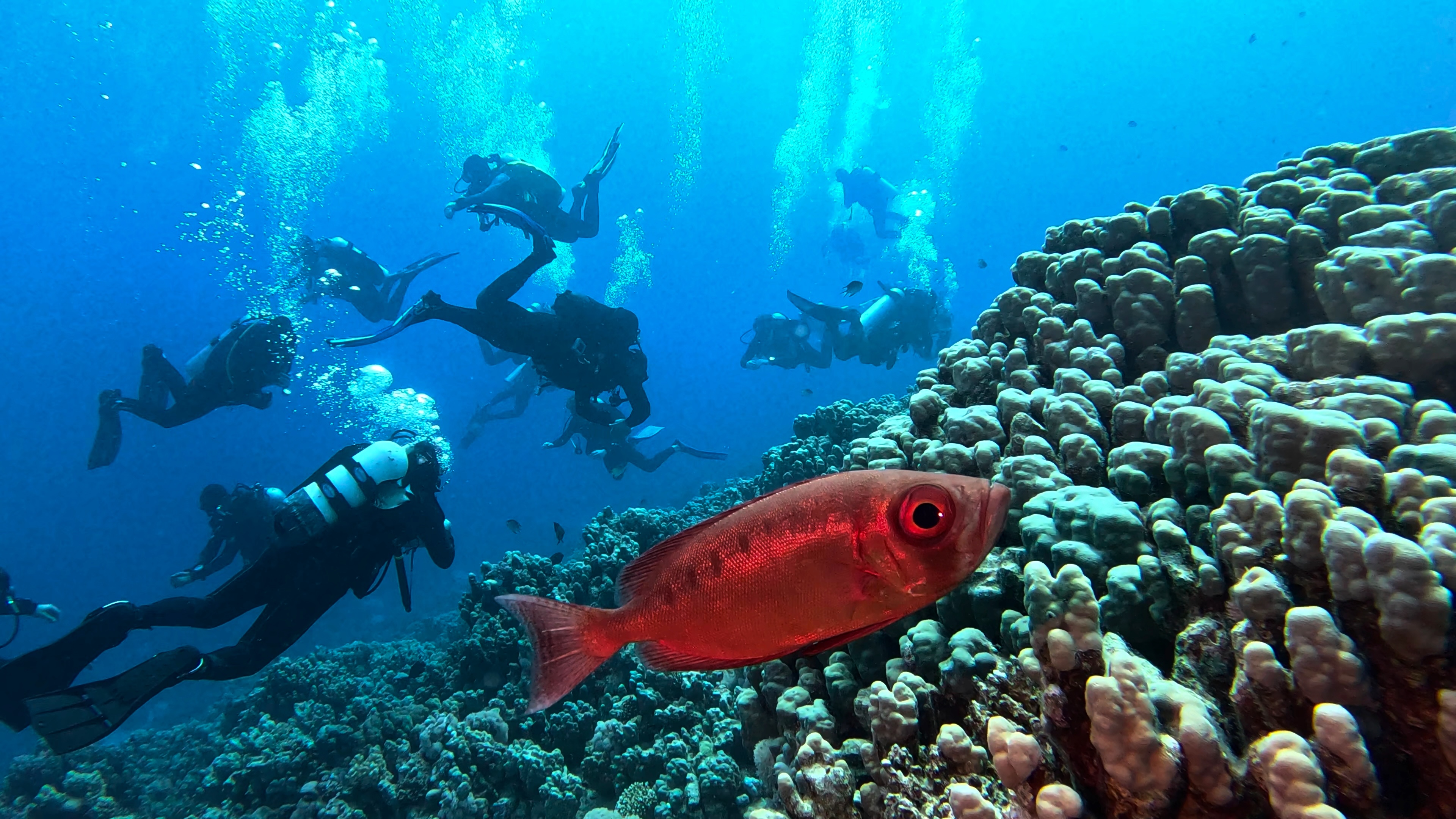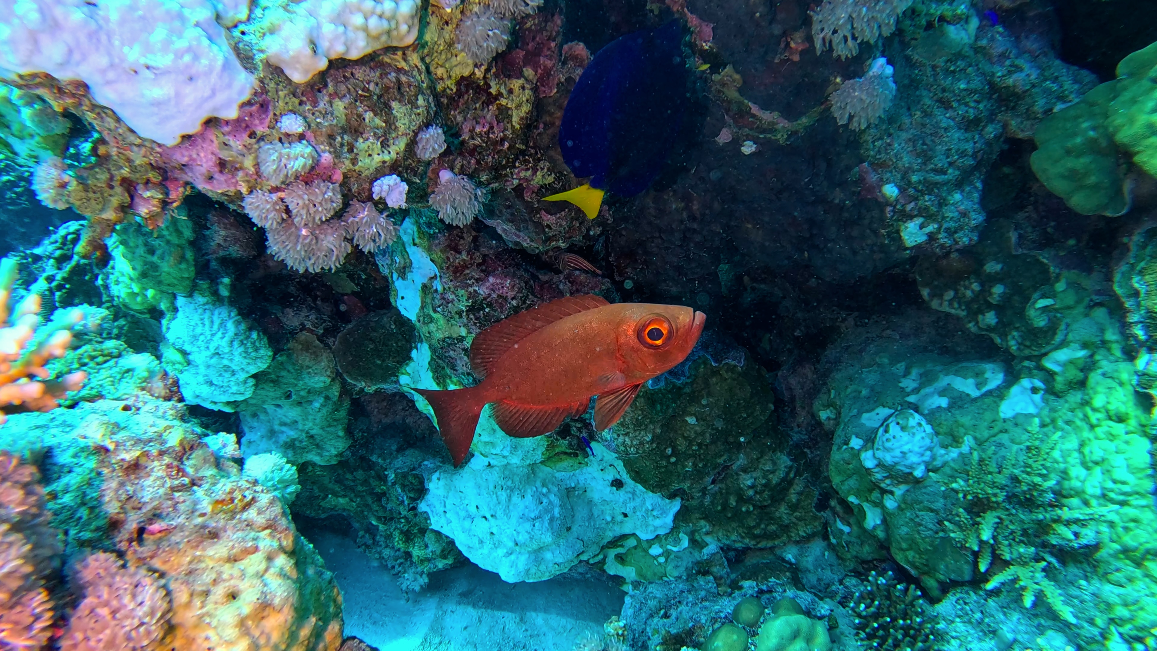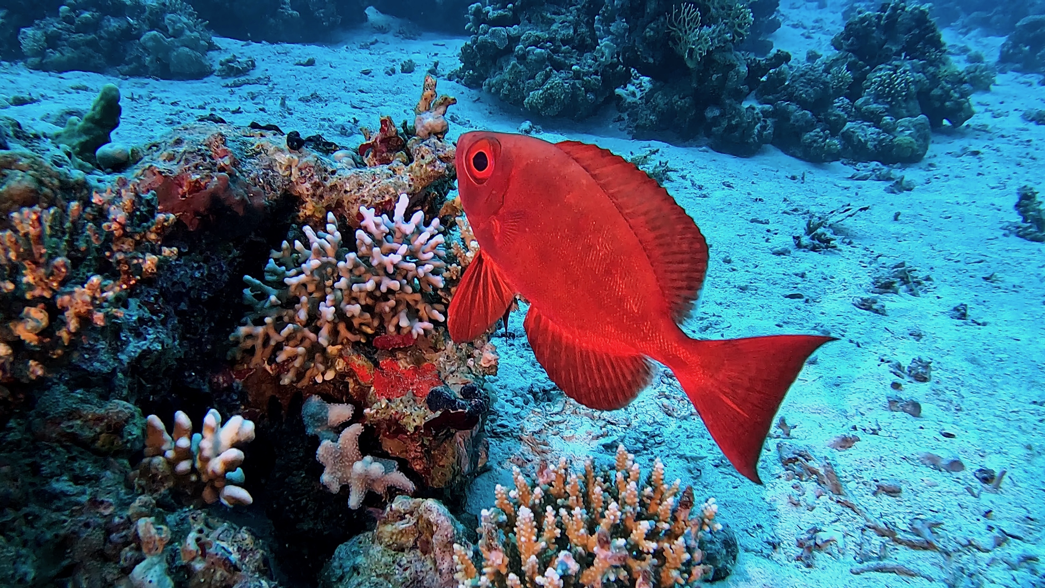 The Bloodspot Squirrelfish is a medium-sized tropical fish with a reddish body and a distinctive dark spot behind the eye. It inhabits tropical coral reefs of the Indo-Pacific region, mainly around rocky and coral habitats. It feeds on small invertebrates and plankton, primarily at night, as it is a nocturnal species. The species is not endangered, but it is sensitive to coral reef destruction and ocean pollution.