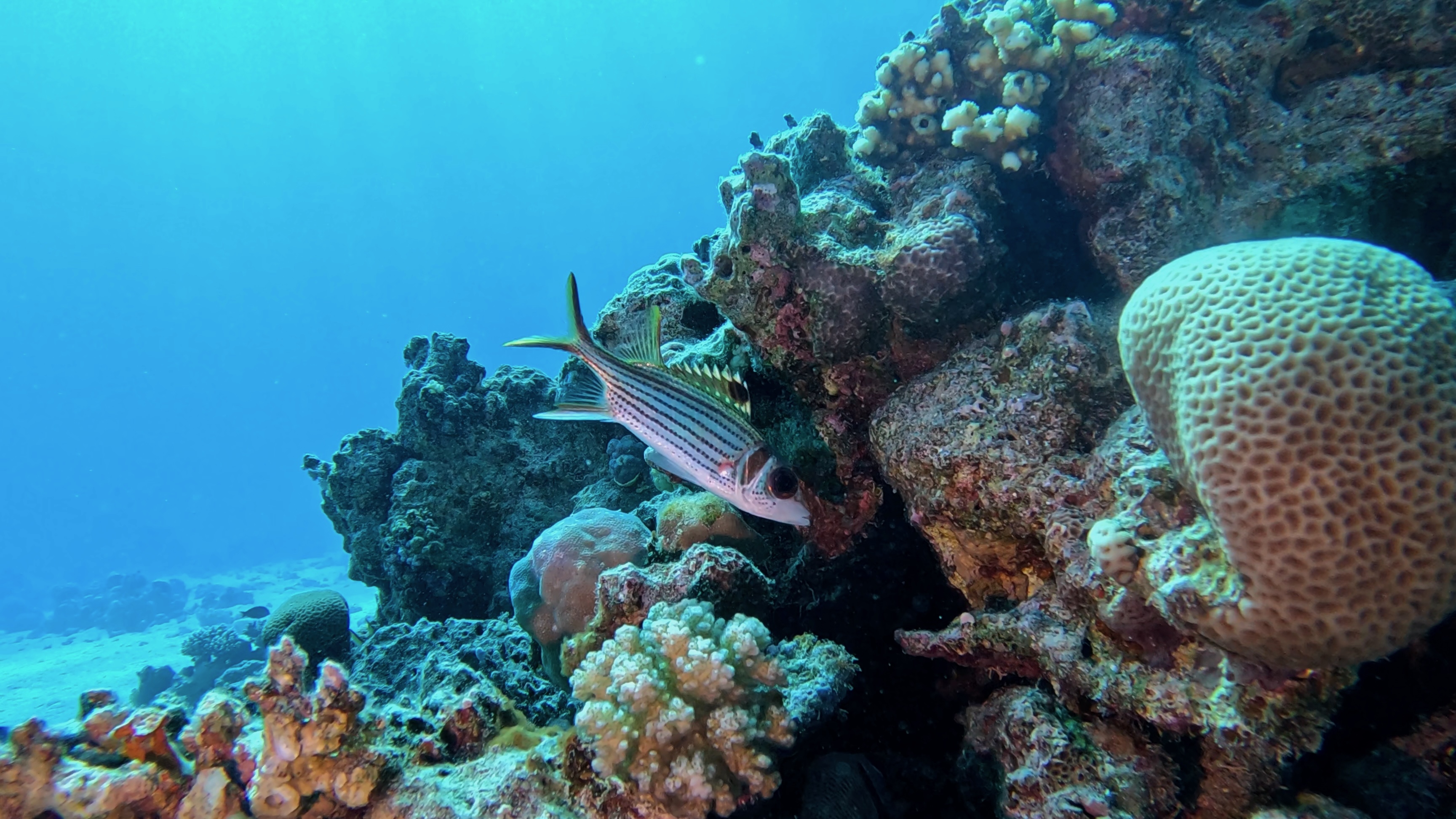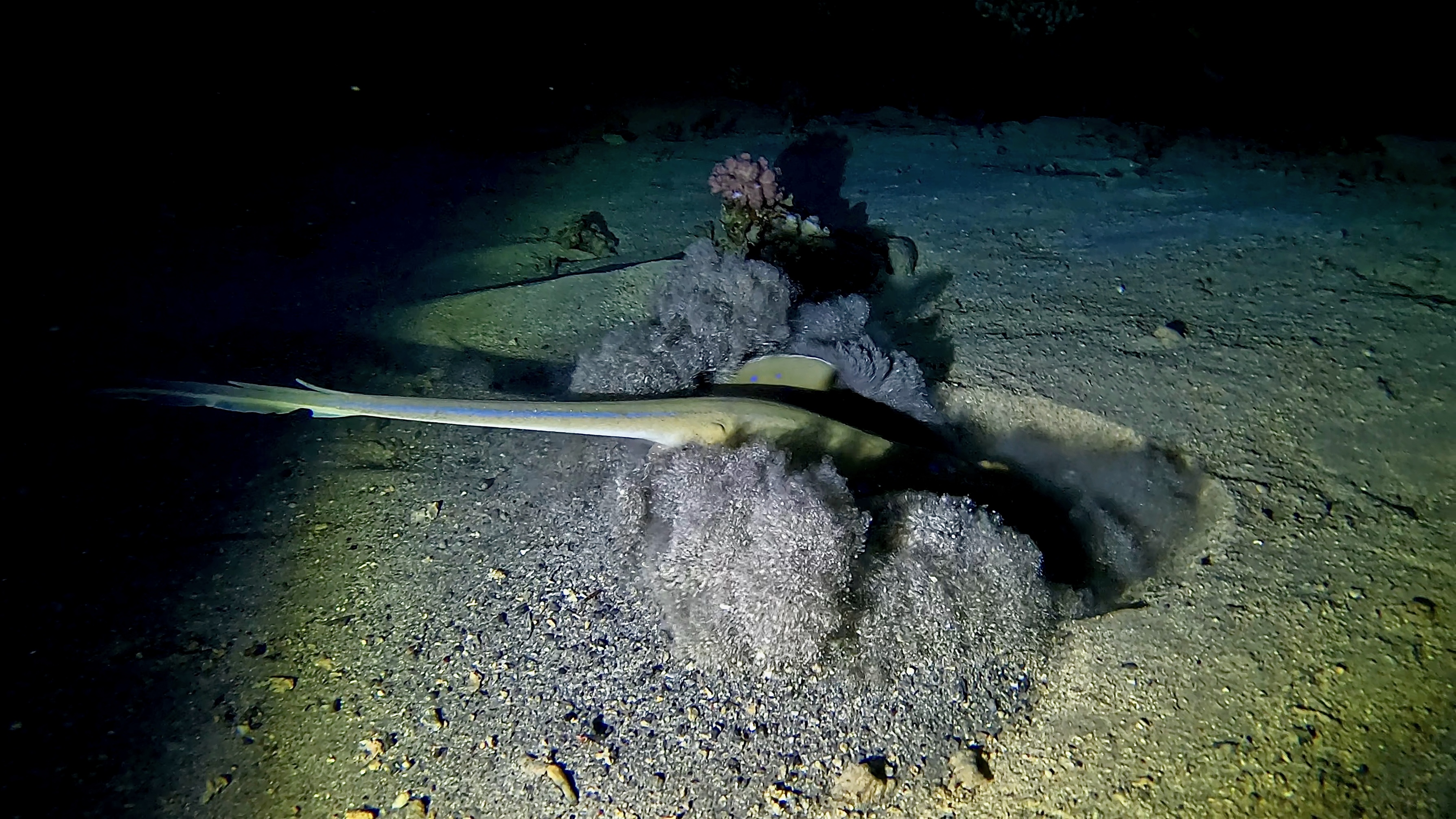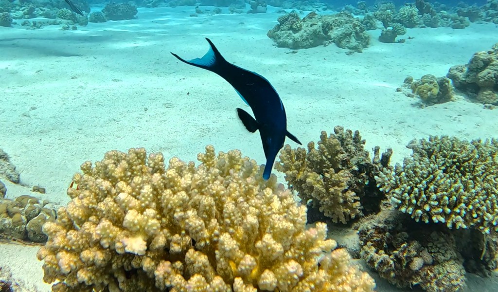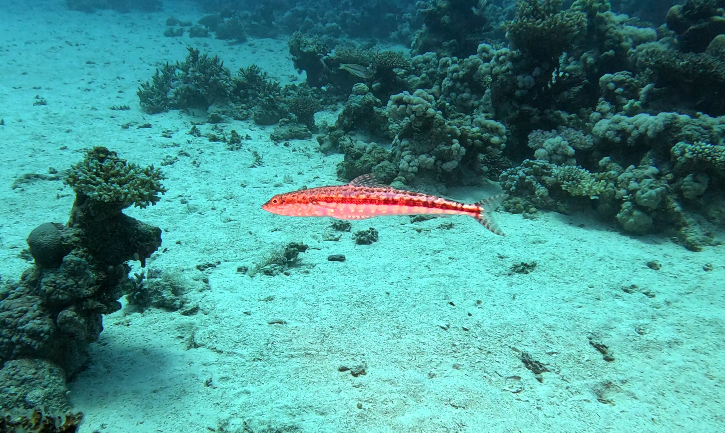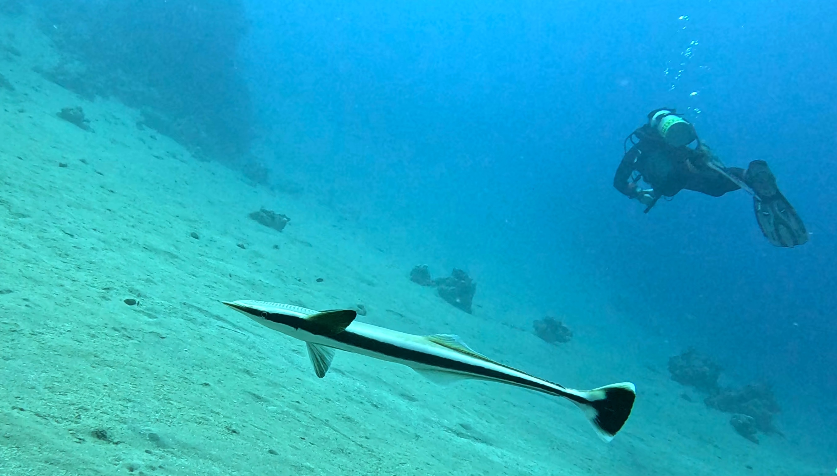 The Cornet Fish (Fistularia commersonii) is a long, slender fish found in tropical and subtropical waters of the Indo-Pacific. Known for its distinctive horn-like snout, it can grow up to 2 meters (6.5 feet) in length. The fish has a greenish-brown to gray body with darker markings, which help it blend into its environment. Cornet fish are commonly found around coral reefs, seagrass beds, and sandy bottoms, at depths ranging from 1 to 50 meters. They are carnivorous, feeding on small fish and invertebrates, and are ambush predators, using their long snout to quickly capture prey. Generally solitary and non-aggressive, cornet fish remain motionless for long periods, blending into their surroundings. They are a fascinating species for divers but pose no threat to humans.
