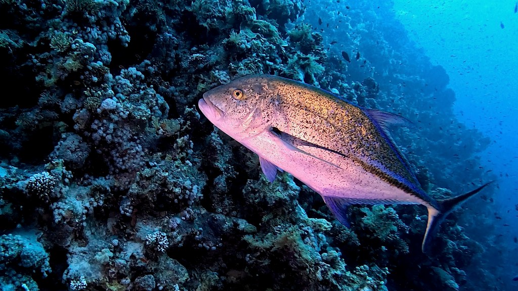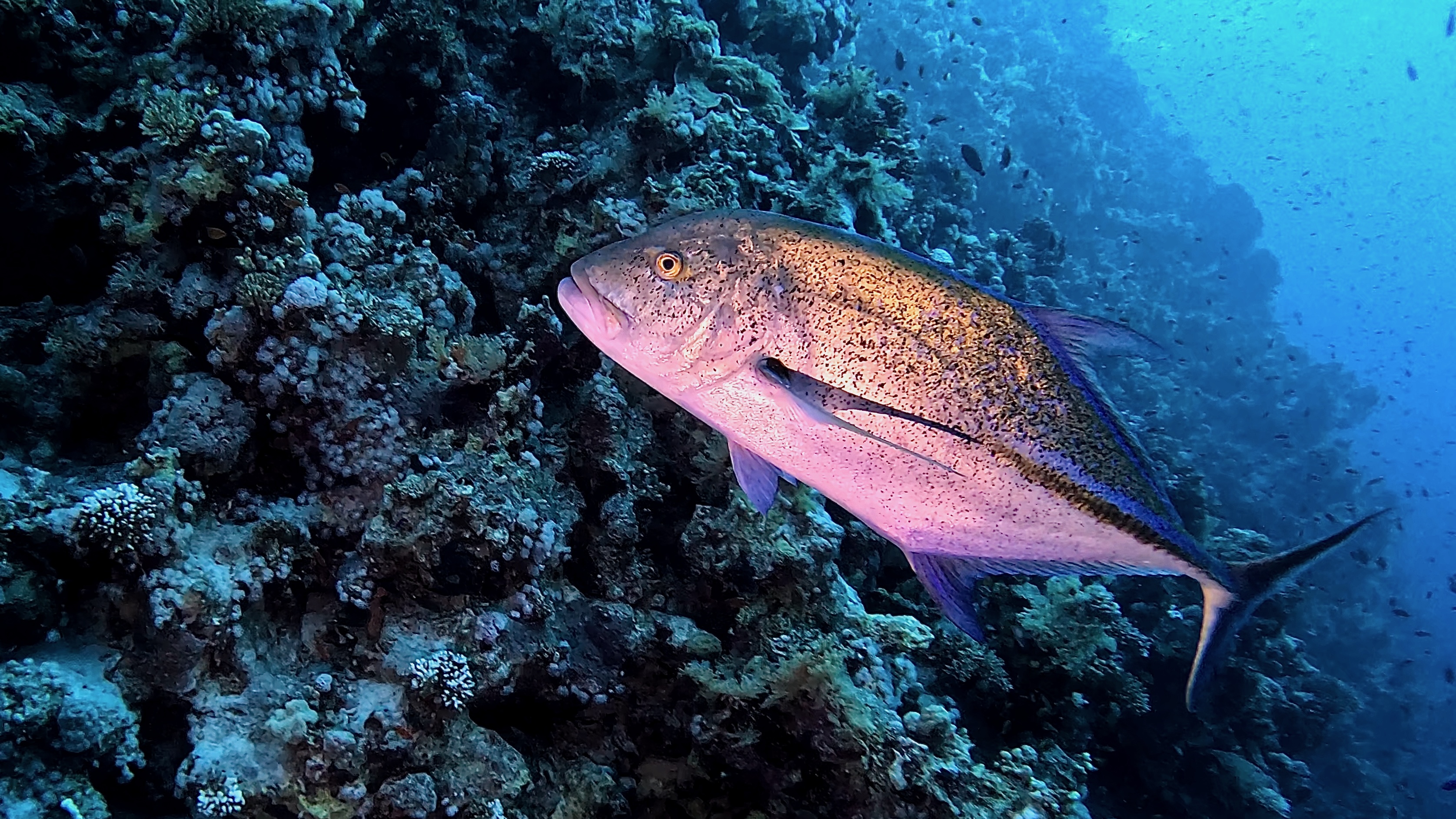 The Blue Trevally (Caranx melampygus) is a fast-swimming, predatory fish found in the warm waters of the Indo-Pacific region, including the coasts of Africa, the Indian Ocean, and the Pacific Ocean. The Blue Trevally typically grows between 30–60 cm (12–24 inches), but can reach up to 1 meter (3 feet) in some cases. It has a sleek, oval-shaped body built for speed, with silver coloring and blue or greenish-blue hues. The fins, particularly the tail fin, are distinctly blue. The fish also has large, round eyes adapted for hunting in both daylight and dimmer light conditions. Its tail fin is deeply forked, helping it swim efficiently and quickly. As a carnivorous predator, Blue Trevallies feed on smaller fish, crustaceans, and cephalopods (squid and octopus). They are social and often hunt in schools, taking advantage of schools of smaller fish to catch prey. Known for their aggression when hunting, they can chase down their prey with remarkable speed. While not currently endangered, Blue Trevally populations should be monitored, especially in areas where overfishing or habitat destruction could affect their numbers.