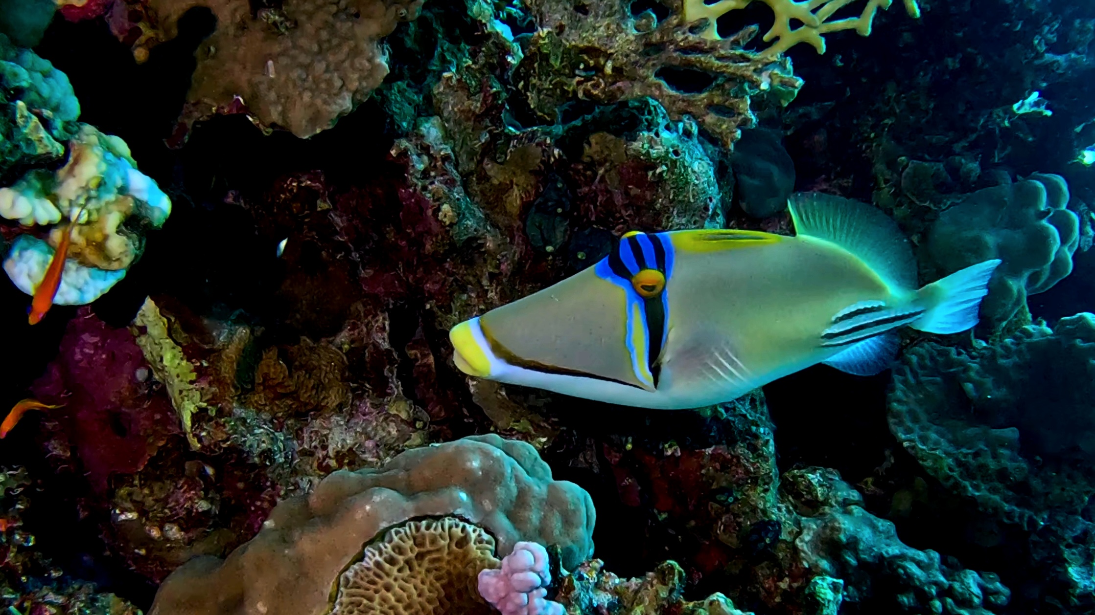 The Picasso Fish, also known as the Picasso Triggerfish, is a tropical fish notable for its striking, colorful patterns that resemble artistic brushstrokes, which give it its name. It inhabits tropical coral reefs of the Indo-Pacific region, often around rocks and corals. Its diet consists of invertebrates, small crustaceans, and plankton. The species is not endangered, but it is sensitive to coral reef destruction and ocean pollution.