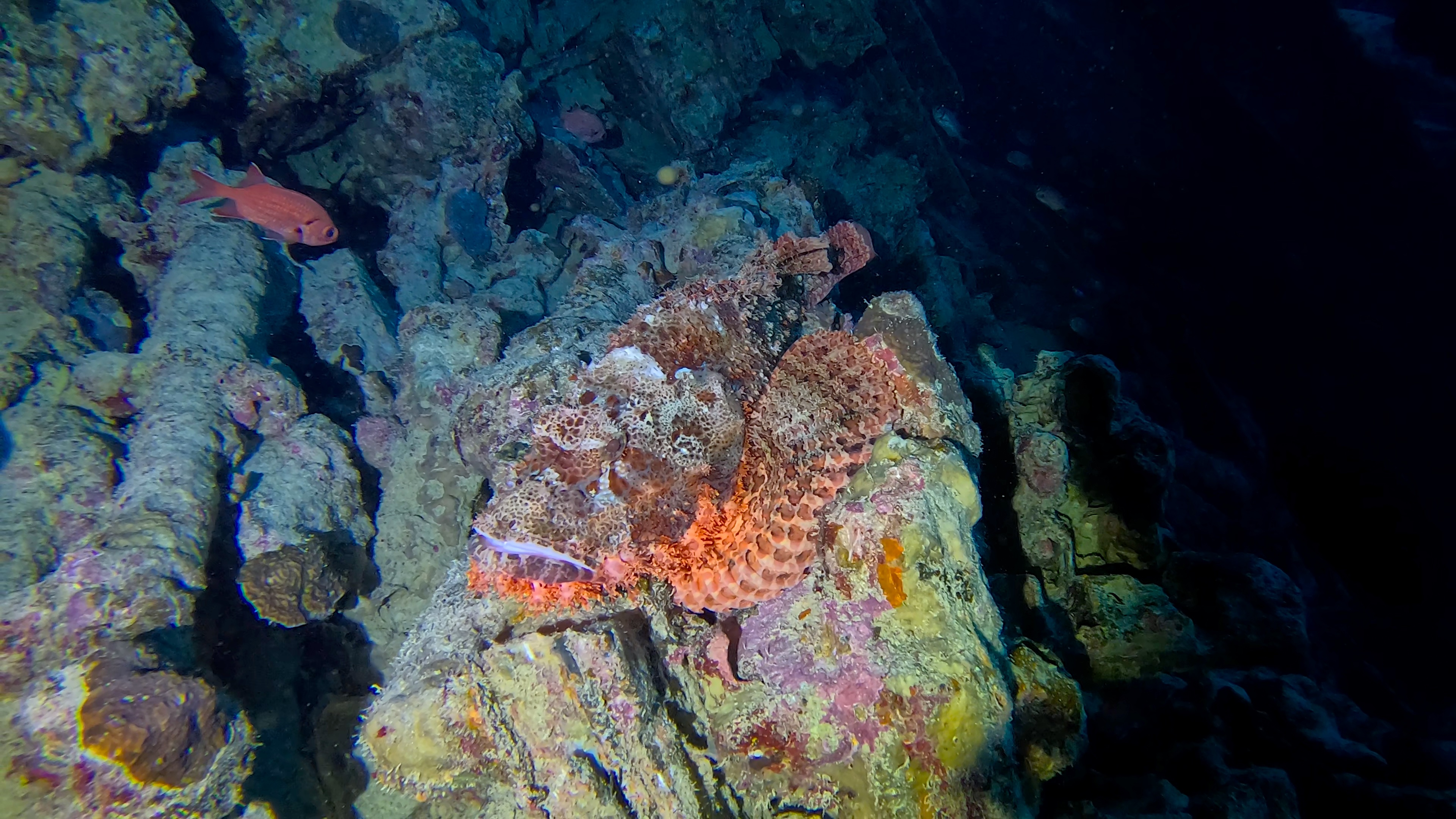 The Stonefish is one of the most venomous fish in the world. Its rough, stone-like body allows it to blend seamlessly with its surroundings, making it nearly impossible to spot. The stonefish is typically brown, gray, or mottled, and its body is often covered with algae or other organisms, enhancing its camouflage. It can grow up to 40 cm in length. Stonefish are found in shallow coastal waters of the Indo-Pacific, particularly around coral reefs, rocky structures, and sandy bottoms, at depths ranging from 1 to 50 meters. Stonefish are dangerous due to their venomous spines on their dorsal fin. When stepped on or threatened, they can release venom through these spines, causing severe pain, swelling, and sometimes death. They are ambush predators, relying on their camouflage to wait for small fish or invertebrates to pass by. The stonefish swallows its prey whole using its large mouth. Although it is not aggressive, the stonefish is dangerous because of its venom and camouflage ability, making it a threat to both divers and swimmers, as it is difficult to spot in its natural environment.